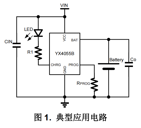 由于采用了内部 PMOSFET 架构,加上防倒充电路, 所以不需要外部检测电阻和隔离二极管。热反馈可对充电电流进行调节,以便在大功率操作或高环境温度条件 对芯片温度加以限制。充电电压固定于 4.2V,而充电电流可通过一个电阻进行外部设置。当充电电流在达到最终浮充电压之后降至设定值 1/10 时,YX4055B 将自动终止充电循环。