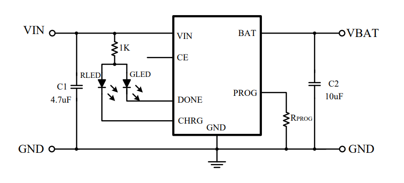 答:芯片的引脚定义包括VIN、GND、LED、BAT和CTRL,分别对应输入电压、地线、充电状态指示LED、电池正极和控制引脚。