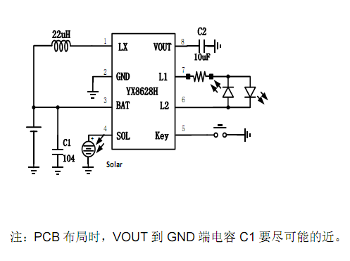 这里推荐单路YX861A芯片是一种专门用于太阳能LED灯驱动的电路芯片;YX861A是一款支持 LED 常亮和闪亮两功能的太阳能灯串控制芯片,适用于 1~2 节 1.2V 充电电池供电的太阳能产品。其主要功能有升压、光控、闪烁和闪烁脉宽调制等。