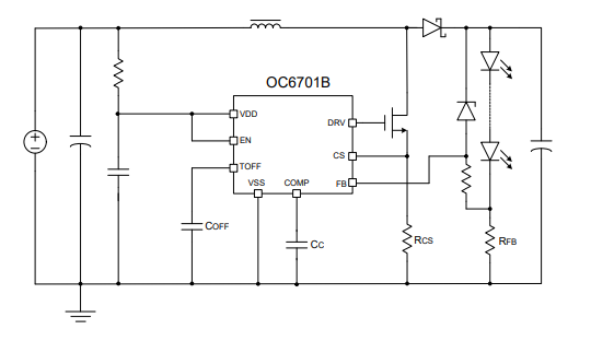 OC6701B采用固定关断时间的控制 方式,关断时间可通过外部电容进行调节,工作频率可根据用户要求而改变。