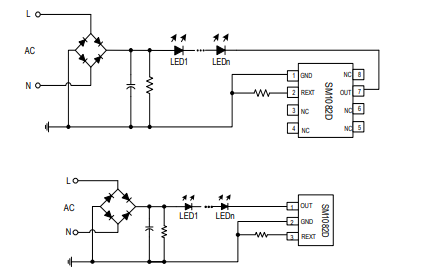 SM1082D是一款用于具有LED球泡灯低过温保护的单通道LED线性恒流控制芯片,芯片使用本司专利的恒流设定和控制技术,输出电流由外接Rext电阻设置,且输出电流不随芯片OUT端口电压而变化,具有较好的恒流性能。 芯片具有过温调节功能,当芯片温度达到过温调节点时,输出电流逐渐下降,起到?;ば酒墓δ?,提高应用可靠性。系统结构简单,外围元件极少,方案成本低。