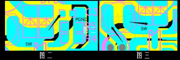 电感的一端连接点需要靠近输入电容的正极,另一端需靠近SW,以最小化开关节点的辐射噪声。增加SW铺铜面积是改善走线阻抗和散热处理,但是扩大铺铜的区域可以用作天线并且可以导致EMI的增加,所以有时需要衡量EMI和散热两者居中考虑。同时不建议电感下面铺地处理,接地层出现的涡流会导致电感的感量变小。