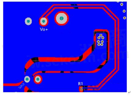 同时FB走线应从输出电容直达反馈电阻,为了减少噪声捡拾,需打个过孔与所有其他接线隔离开来。不要直接在顶层上进行 Vo+引脚布线,并且此走线用GND包络最佳。