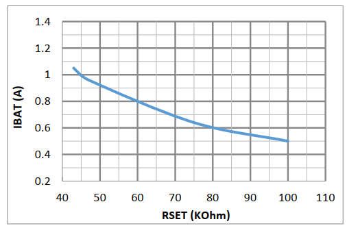 内部锂电池充电。充电电流透过 RSET 进行调节, RSET 与充电电流的关系曲线图如下: