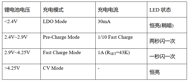 C. 在充电模式下, LED 闪烁速率将依据锂电池的电压准位而改变,对照如下: