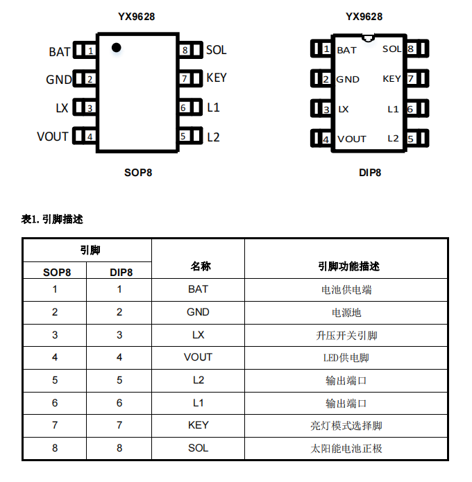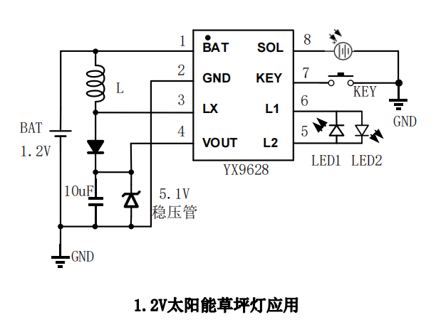 YX9628采用双通道桥式输出结构设计,极大的 简化了系统结构,适用于一节1.2V充电电池,直接驱动两路无极性LED灯串,简化了连接方式;输出电流大, 可用于对亮度要求较高的太阳能灯串产品。