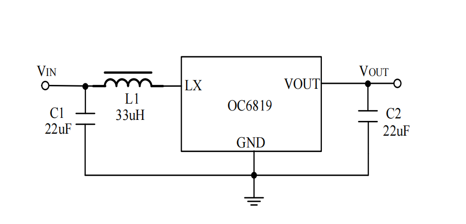 OC6819 外围仅需 3 个元件,即可实 现将低输入的电池电压转换到所需要的工作电压。