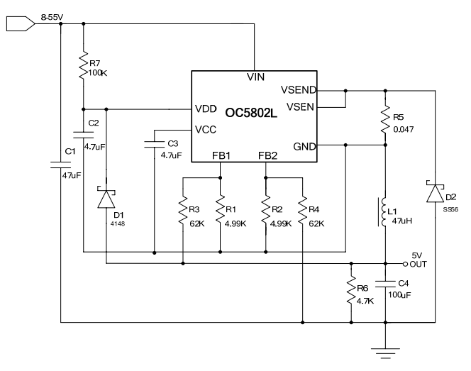 OC5802L 是一款支持宽电压输入的开关降压型 DC-DC,芯片内置 60V/5A 功 率 MOS,支持最高输入电压 55V。