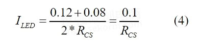 系统稳定后,可假设负载RGB灯珠上的电压稳定,于是可近似认为电感电流呈线性变化。故由前面叙述可知,电流取样电阻RCS上的电流与负载RGB灯珠上电流相等,于是电阻RCS的取值决定了负载电流的大小。